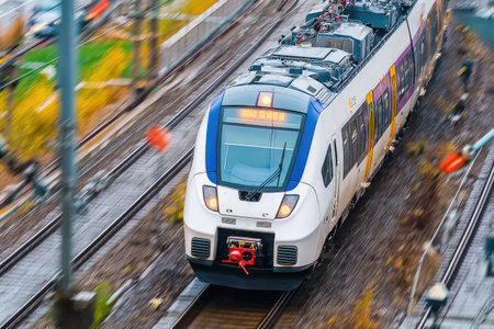 A high-angle view showcases a modern train in motion, traveling along parallel tracks. The train exhibits a white and blue color scheme, with a blurred motion effect suggesting speed. The outdoor setting indicates a transport system suitable for various commercial purposes. The image is designed to be used in media.