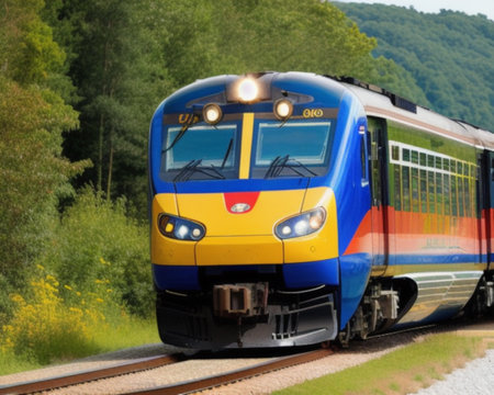 Capture the essence of travel with this vibrant EMU train weaving through a lush landscape, showcasing color and modern design against a serene backdrop.