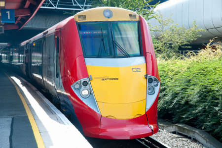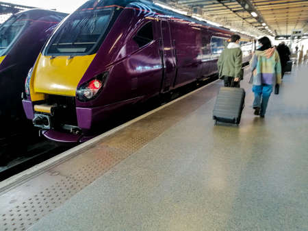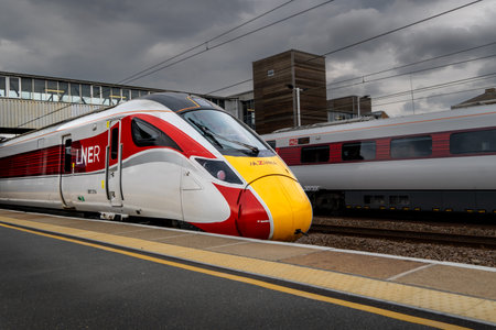 PETERBOROUGH, UK - AUGUST 18, 2023. A high speed Hitachi Azuma AT300 Intercity passenger trains in LNER livery ready to depart the platform at Peterborough Rail station