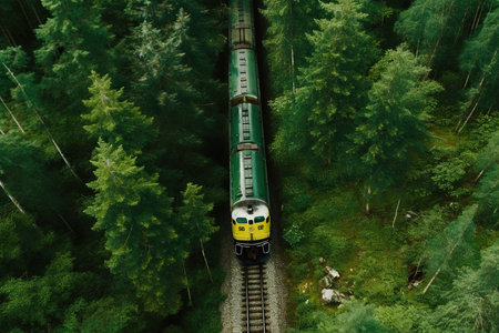 From a bird's eye view, a train snakes through a lush and verdant forest, surrounded by towering trees and a natural landscape. AI Generative AI.