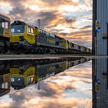 LEEDS, UK - APRIL 12, 2023. A line of stabled Class 70 Freightliner locomotives at sunset on Leeds maintenance depot reflected in water