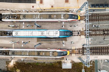 DONCASTER, UK - MAY 13, 2023. Aerial view directly above high speed passenger trains in a maintenance yard with overhead electric wires
