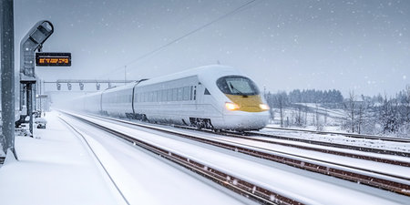 A Modern High Speed Train Gliding Through a Beautiful Snow Covered Landscape in Winter s Embrace