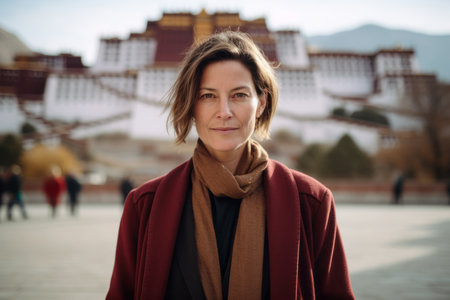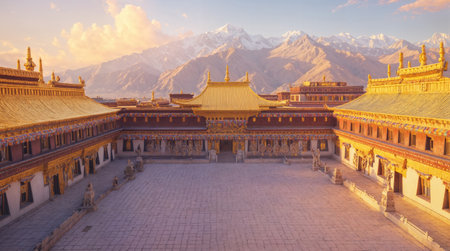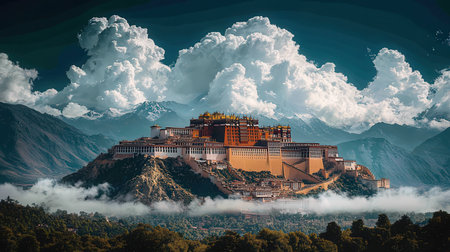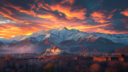 Potala Palace's sacred grandeur shines amidst Lhasa's modern cityscape and snow-capped peaks. AI-generated
