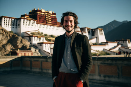 Portrait of a handsome man with a beard in a black jacket and red pants against the backdrop of a Buddhist monastery.