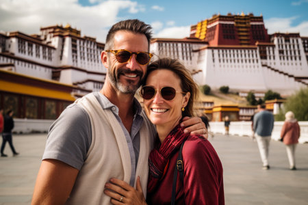 Portrait of a loving couple in front of a Buddhist temple in Tibet