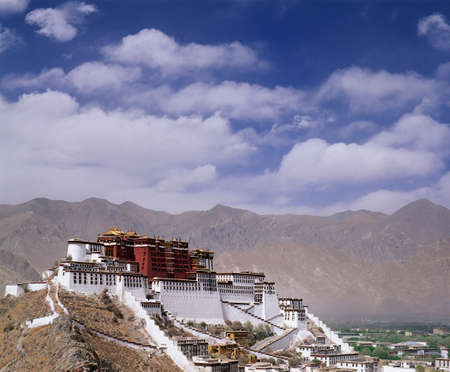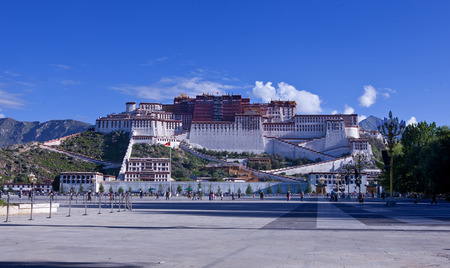 Lhasa, capitol city of Tibet. The Potala Palace in Lhasa, Tibet, China. A wide angle photography in Chengguan, on the road side with view of the dzong. white clouds on a blue sky