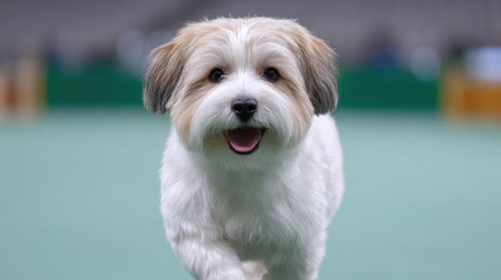 Close-up of a tricolored Coton de Tulear dog looking straight at the camera
