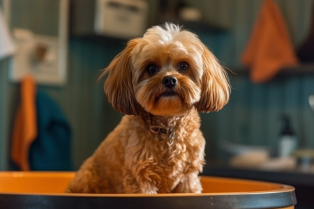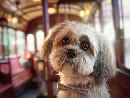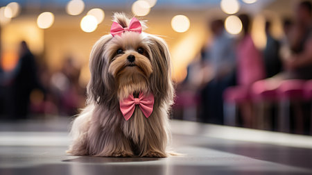 Close up of lhasa apso dog with orange bow. small domestic animal.
