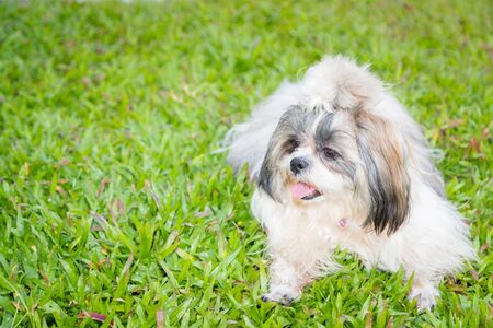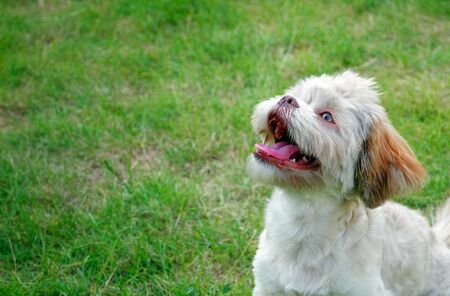 Shi tzu dog staying on the green grass. White dog looking for something on green grass in the park.