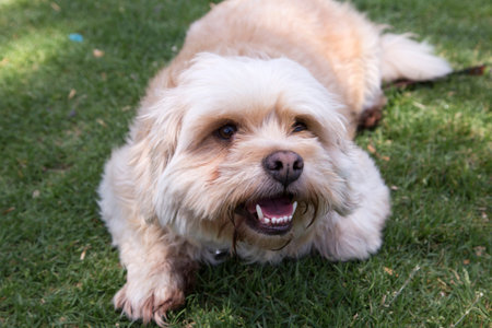 Brown shih poo sits on the green grass outside and look around.