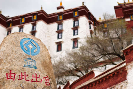 Unesco sign on stone in front of Potala palace in Lhasa, Tibet