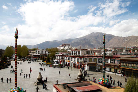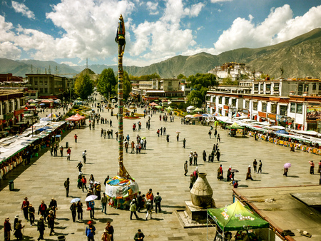 Lhasa, Tibet, China - Oct, 2010: Barkhor square from the rooftop of the Jokhang temple, with the Potala Palace in the background