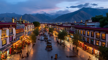 An aerial view of Barkhor Street in Lhasa, Tibet, at dusk. Traditional Tibetan buildings line the street, illuminated by warm lights from shops and street lamps. In the background, majestic mountains rise against a twilight sky. People are seen walking along the paved street, creating a sense of activity and life.