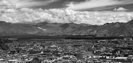 A view on Lhasa roofs , mountains and clouds in Tibet