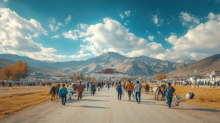 Mongolian people walking on the road to the temple.