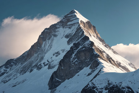 A scenic spectacle of a high-alpine mountain, its rugged facade softened by the cover of snow, set against a backdrop of a clear, cloud-flecked sky.