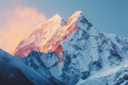 Beautiful sunset with pinkish clouds over Himalayan mountains. Lhotse mountain south face view from Everest Base Camp Trek. Himalaya mountains landscape, Sagarmatha National Park, Nepal.