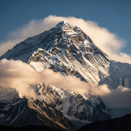 A majestic mountain, its peak covered in snow, dominates the frame, partially obscured by soft, enveloping clouds. The image displays a natural landscape with variations in tone and texture. It features cold colors contrasted with warm sunlight, potentially suitable for travel or environmental publications.