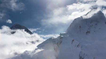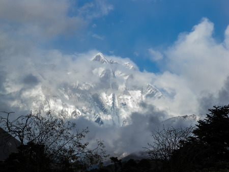 Snowed Mountain peaks hidden in clouds in Himalayas. Travel to Nepal