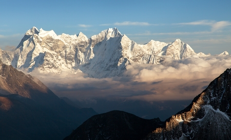 Evening panoramic view of mounts Kangtega and Thamserku fromm Gokyo Ri, Everest area, Khumbu valley, Nepal