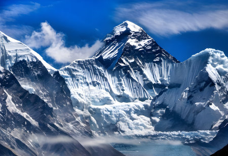 A beautiful scenery of the summit of Mount Everest covered with snow under the white clouds