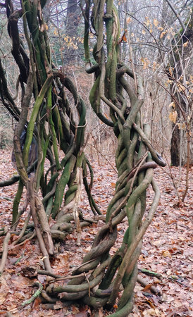 Beautiful wooden vines tangled with green leaves. NAtural parkland scenery.