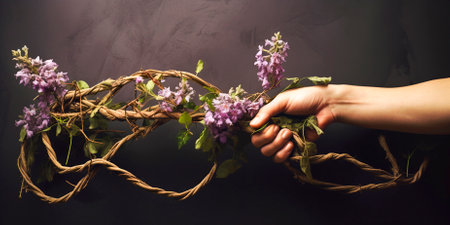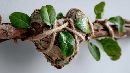 This captivating image features a heart shape crafted from leaves and twigs, intricately tied with twine, symbolizing love and nature.