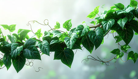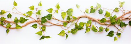 Vibrant green vines twist gracefully, their leaves displaying various shades of green against a textured white background. This botanical arrangement breathes life into the serene space.