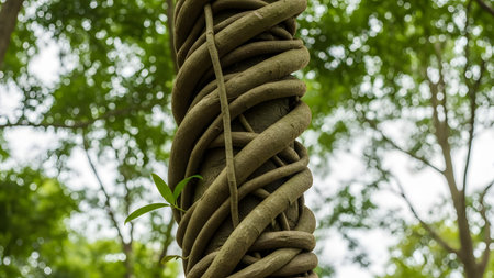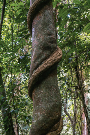 Twisted vine wraps around tree trunk in lush forest