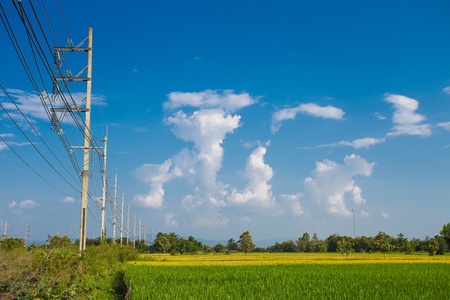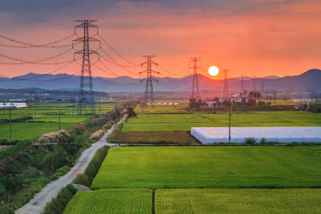Power transmission towers in the rice fields. Power transmission towers from power plants through the rice fields.