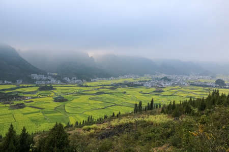 beautiful wuyuan mountain village in morning mist, rapeseed flowers blooming in China's most beautiful countryside.