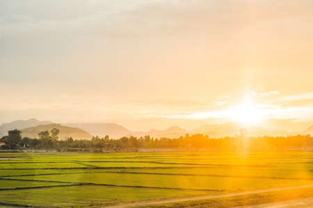 Beautiful view of rice paddy field during sunset . Nature composition.