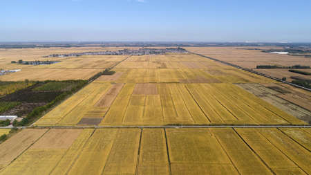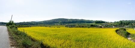 Rural scenery with golden paddy rice farm under sky in Taiwan, Asia.