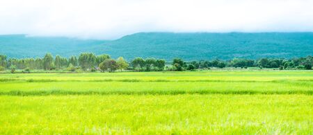 Rice field and mountain in the morning. Beautiful nature landscape.