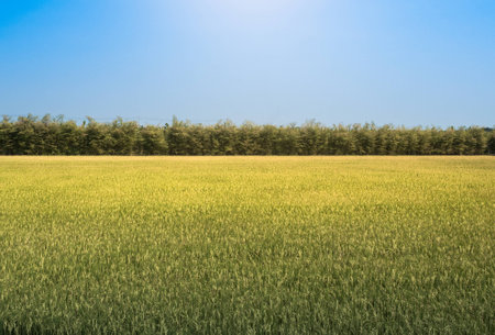 Rice field under the sun and clear blue sky. For design with copy space for text or image.