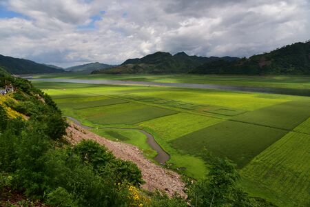 Farmland and lake below Yulong Snow Mountain, Lijiang