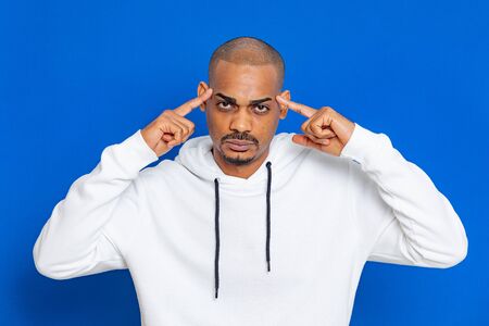 African guy wearing a white sweatshirt on a blue background