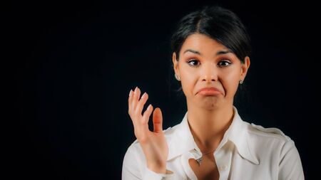 Business man holding hands near face, grimacing and looking at camera. Disgust concept. Isolated front view on white background.