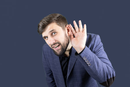 curious businessman listening to conversation. Face expression, reaction, emotion. Privacy concept