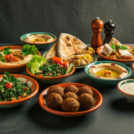 Authentic Egyptian dishes displayed on wooden table, featuring colorful ingredients, textures, and traditional serving styles, creating a warm and inviting atmosphere