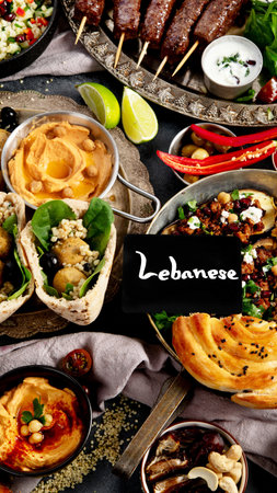 Middle Eastern or Arabic cuisine with a variety of dishes on a dark background. Top view.