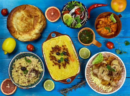 Maghreb cuisine . Traditional assorted Maghreb dishes, Top view.