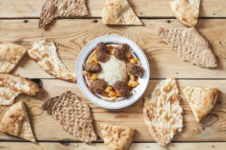 Traditional Turkish dinner include pilaf (boiled rice), lentil soup, Izmir meat balls with potatoes, sarma, kibbeh (aka icli kofte), dried date fruits. Ramadan iftar (evening meal after fasting).