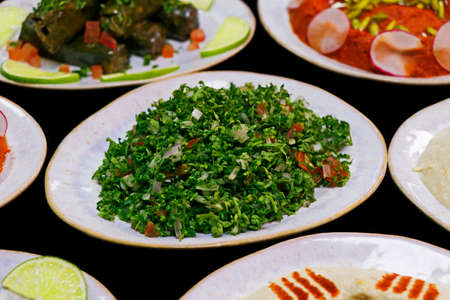 libanese arabic food mezze, includes hummus, muhammara, moutabal, taboule and vine leaves