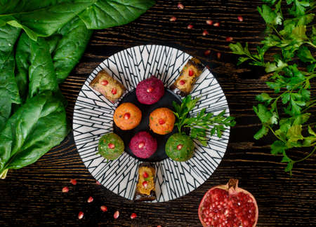 Assortment of pkhali from beets, spinach, carrots, eggplant rolls garnished with parsley and pomegranate. Georgian appetizer on a black and white plate with spinach and parsley leaves. Top view.