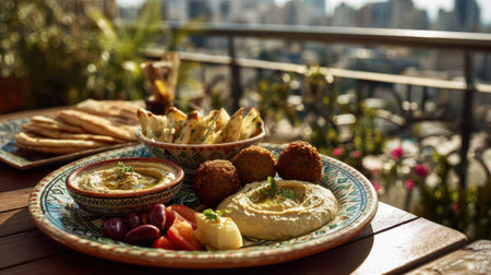 Mediterranean mezze platter with hummus, falafel, olives, and pita bread on decorative ceramic plate served outdoors on sunny balcony terrace with urban skyline view and blooming flowers.