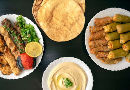 Famous traditional Arabic, Turkish, Israel food. Grilled chicken, kofta kebab, mahshi, cabbage rolls, pita bread, tahini on white plate on dark wooden background, top view. Kafta kebab and mahshi