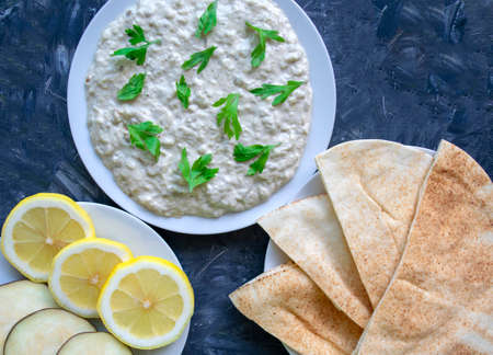 Famous traditional Arabic cuisine - dip Baba ghanoush with pita bread and fresh lemon on dark gray background. Flat lay, top view. Baba ganoush.