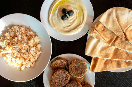 Famous traditional Arabic, Middle East, Israel cuisine. Tahini sauce, pita bread, rice and falafel on dark wooden background. Flat lay, top view.
